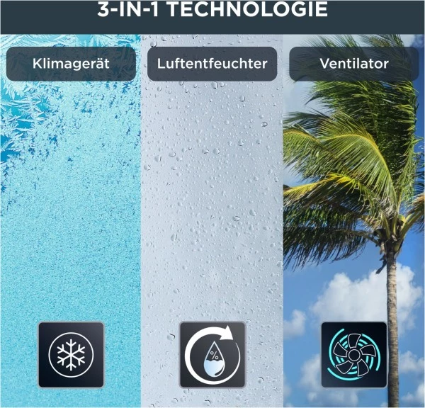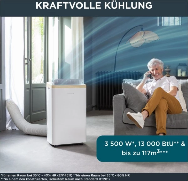 Turbo Eco Sense+ vereint kraftvolle Kühlung mit Energieeffizienz — in einem tragbaren und kompakten 3- in-1-Design, das Klimaanlage, Luftentfeuchter und Lüfter in einem Modell kombiniert. Genießen Sie das Gerät ungestört und in allen Räumen zuhause und reduzieren Sie gleichzeitig Ihren Energieverbrauch, dank des eigenen Energiesparmodus und der Energieklasse A.