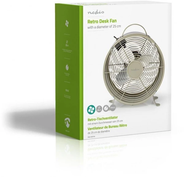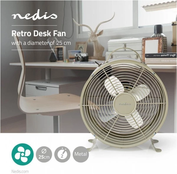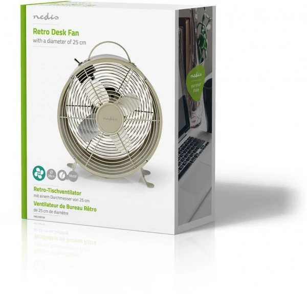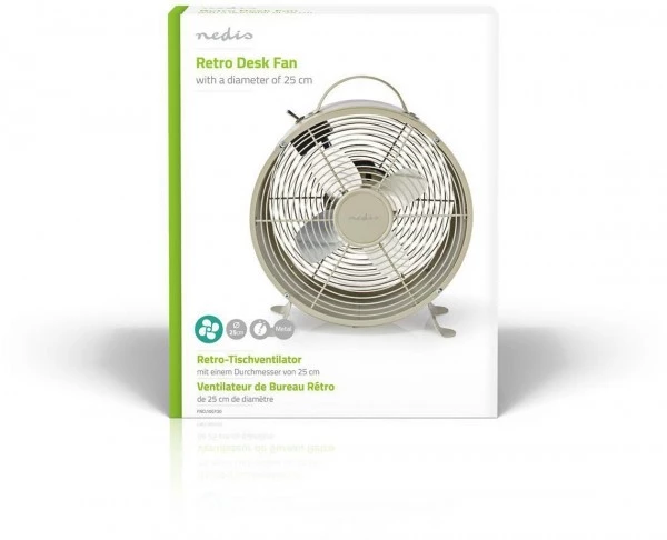 Die solide Vollmetallbausweise und die rutschfesten Füße dieses Nedis®-Tischventilators im Retro-Look sorgen dafür, dass er sicher auf Ihrem Ess- oder Schreibtisch steht. Er hat zwei Geschwindigkeitseinstellungen, die selbst an den heißesten Tagen sowohl zu Hause als auch im Büro für eine erfrischende Brise sorgen.
