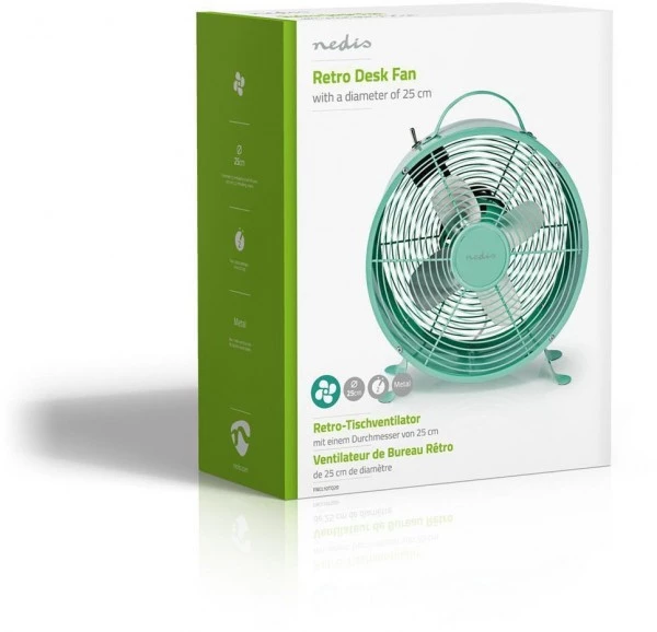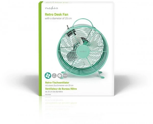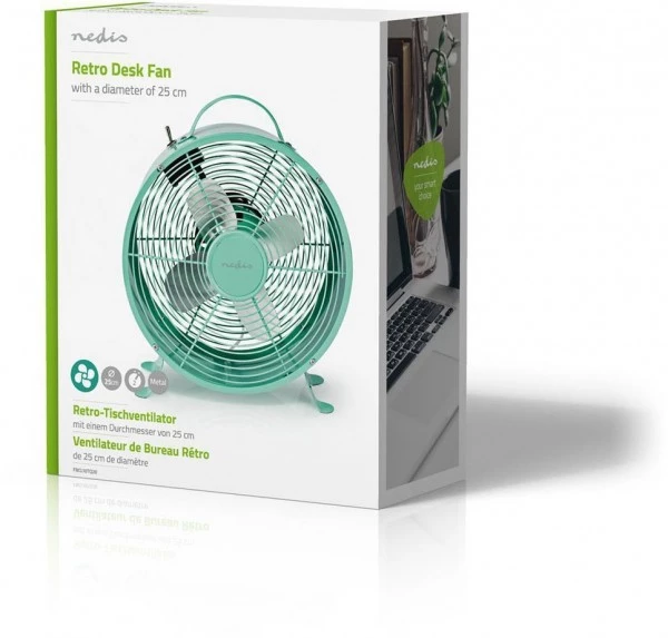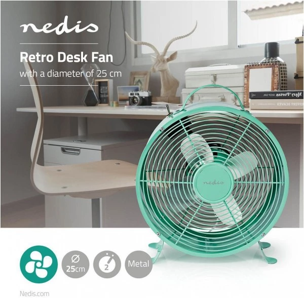 Die solide Vollmetallbausweise und die rutschfesten Füße dieses Nedis®-Tischventilators im Retro-Look sorgen dafür, dass er sicher auf Ihrem Ess- oder Schreibtisch steht. Er hat zwei Geschwindigkeitseinstellungen, die selbst an den heißesten Tagen sowohl zu Hause als auch im Büro für eine erfrischende Brise sorgen.